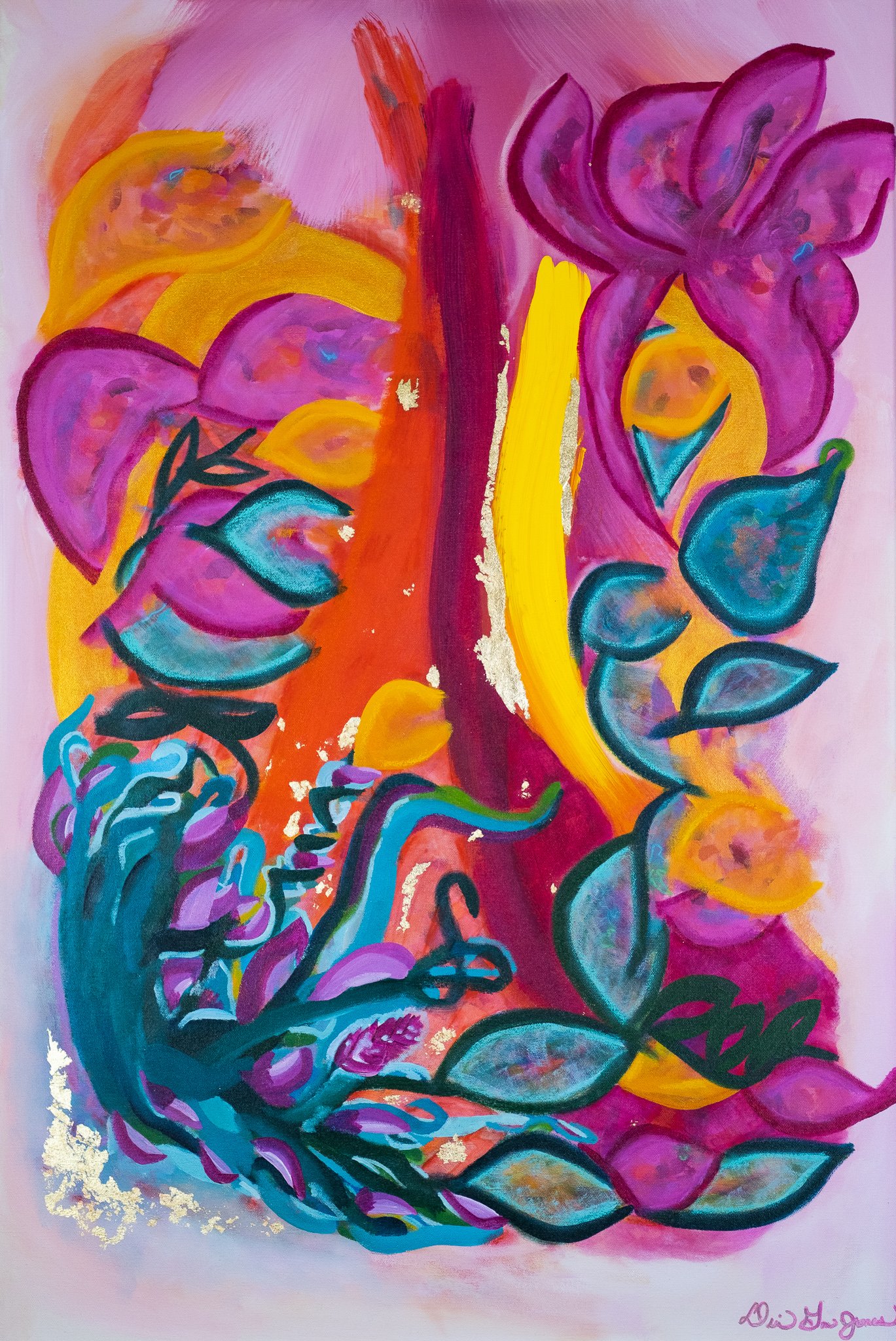 acrylic, oil pastel, metal leaf on 36 x 24” cotton canvas with 3/4” sides